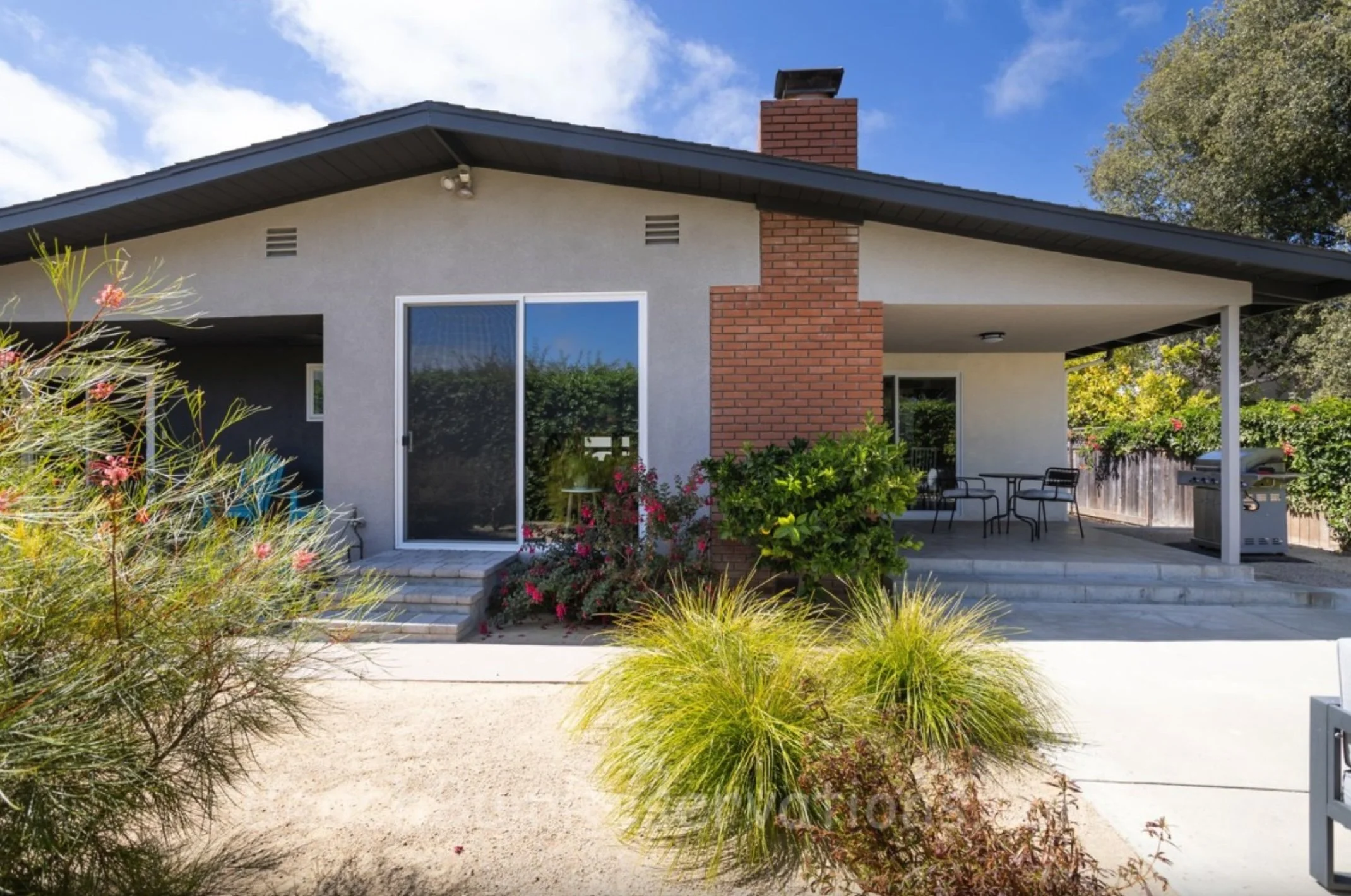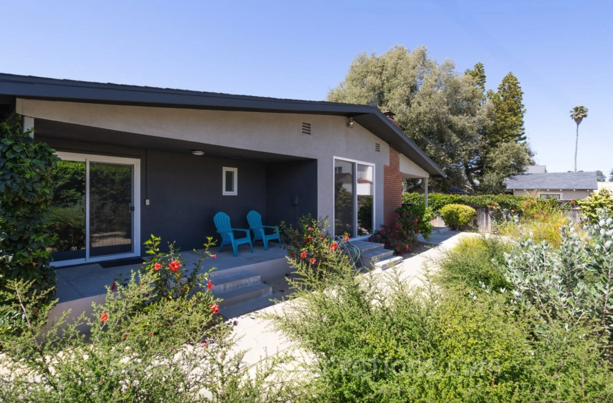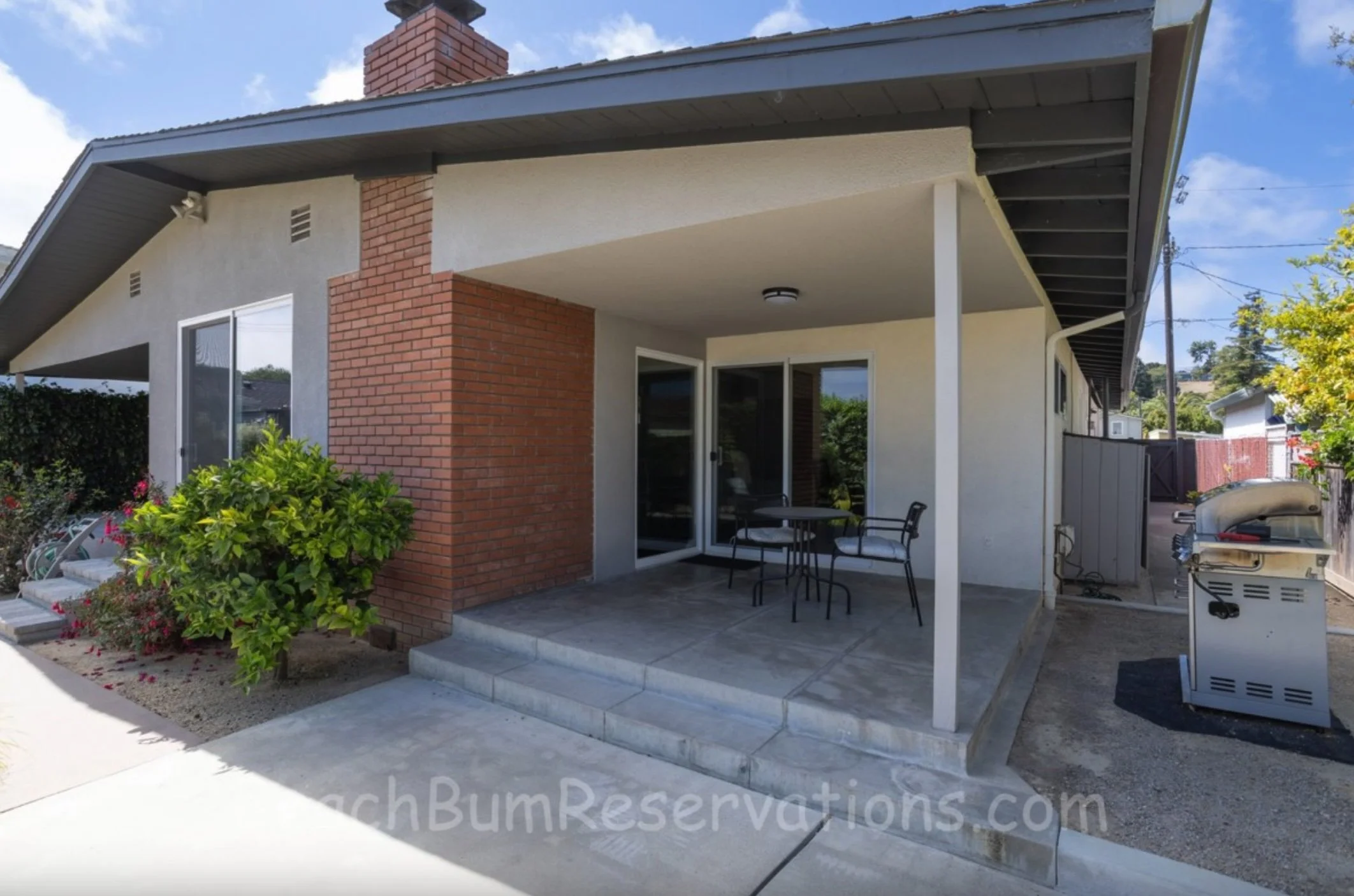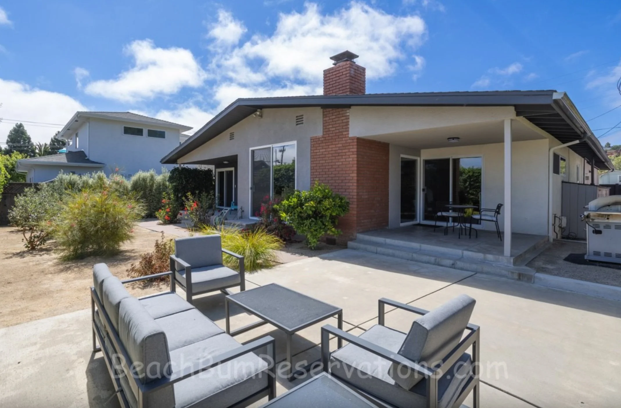 The midcentury home is fully remodeled and refurnished with everything a couple or family needs for a vacation stay. The primary bedroom has a private patio that overlooks a newly landscaped garden filled with native plants. The front bedroom has two twin beds and overlooks the front garden, while the den has a convertible sofa/queen bed and desk. The living room is appointed with a huge smart TV and a cozy gas fireplace. High-speed wireless internet is available throughout.
